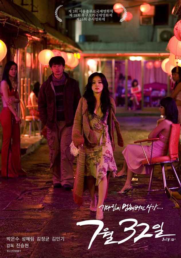 « 7-wol 32-il » (7월 32일), ou « July 32nd » pour la distribution internationale, est un film dramatique indépendant datant de 2010, réalisé par Jin Seung-hyeon. Les acteurs principaux sont Park Eun-soo, qu’on a pu voir dans « Lump sugar » (2006), Kim Jung-kyoon, qu’on a pu voir dans « Dead Again » (2019), Sung Hye-rim, qu’on a pu voir dans « Radio Dayz » (2007), et Kim Min-ki, qu’on a pu voir dans « Death in Desert » (2015). Ce métrage est paru en salles coréennes le 22 avril 2010.